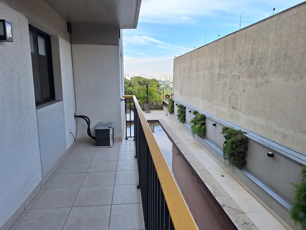 Apartamento está mobiliado (móveis planejados na cozinha, sala, quarto e banheiro, além de sofá, mesa com 4 cadeiras, cama e colchão), tem uma ampla varanda, ar-condicionado e vaga na garagem.