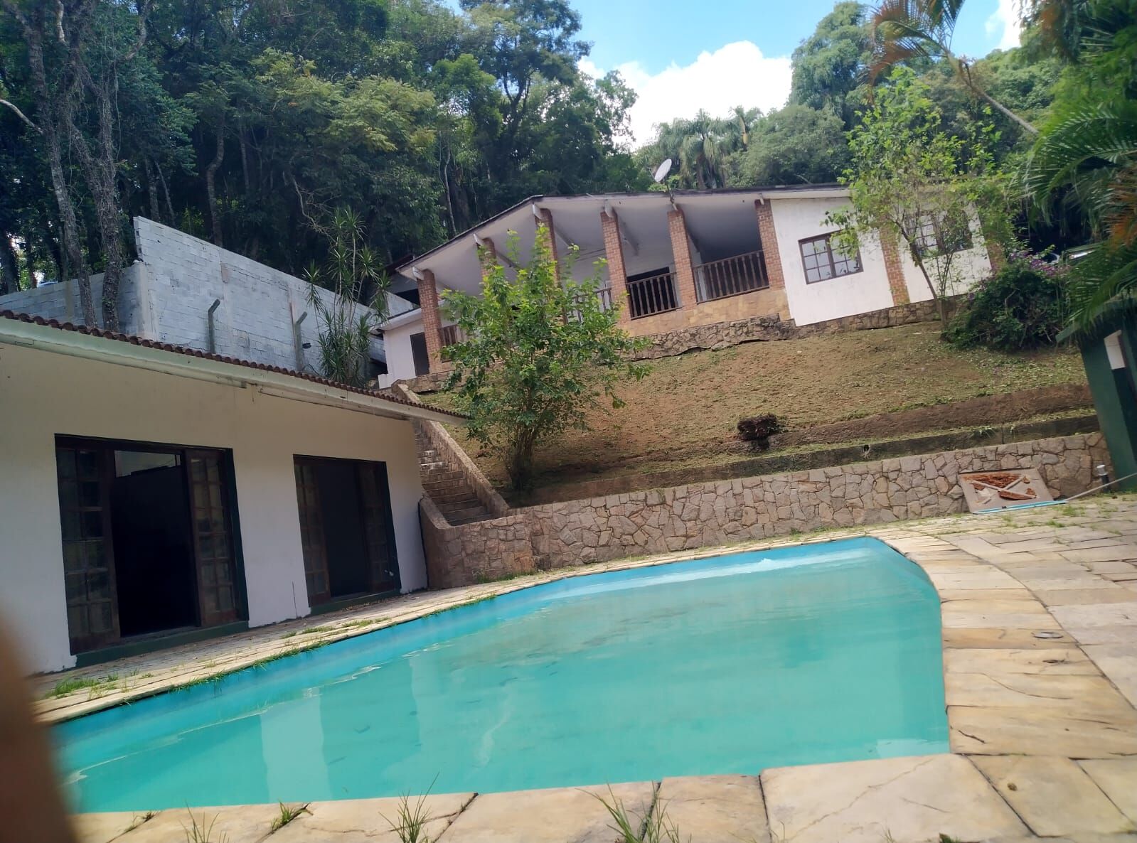 Área de lazer; Entrada individual ,amplo salão com 1 quarto, banheiro, churrasqueira, forno pizza, piscina10x 4 M e sauna faltando porta e aparelho, poço artesiano